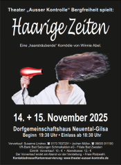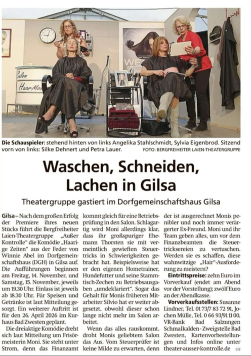 Nachdem wir unser letztes Stück wegen Renovierungsarbeiten am DGH nicht in Gilsa aufführen konnten, freuen wir uns umso mehr auf eine Rückkehr zu unseren Freunden. Wir werden uns jedenfalls sehr bemühen, euch allen einen unvergesslichen Abend (und wer unbedingt möchte auch eine unvergessliche Frisur, ich kümmer mich persönlich...) zu bereiten.